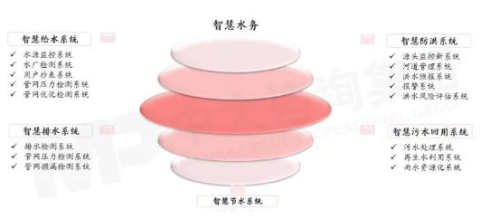 智慧水務系統由智慧給水、智慧排水、智慧防洪、智慧污水回用、智慧節水等五大子系統構成,每個子系統下又包含水源監控、水廠檢測、用戶超表等不同功能模塊。